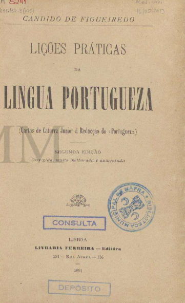 Título completo: Lições Práticas de Lingua Portugueza: cartas de Caturra Junior á redacção do “Portuguez” Local de publicação: Lisboa/ Portugal Quantidade de edições: ? Editora: Livraria Ferreira – Editora Gramática normativa: “As publicações periódicas, difundindo-se progressivamente por todos os recantos do paiz, têm produzido, de involta com ensinamentos e progressos abençoados, deploráveis abusos no falar […]