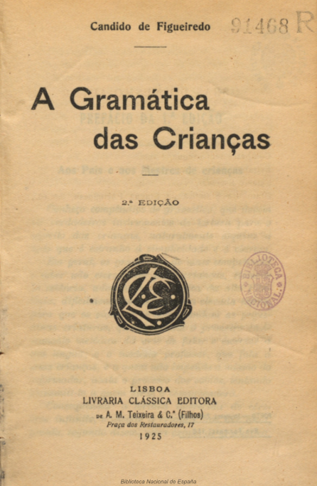 Título completo: A gramática das crianças Local de publicação: Lisboa/Portugal Quantidade de edições: 2? Editora: Livraria Clássica Editora, D. A. M. Teixeira & C.ª Filhos Gramática escolar (LM): “A gramática das crianças” (Título); “Ensinemos pois às crianças gramática sem mistérios, sem problemas enreados, sem terminologias abstrusas” (sic, prefácio, p. 8); “[…] procurei, nestas páginas, simplificar […]