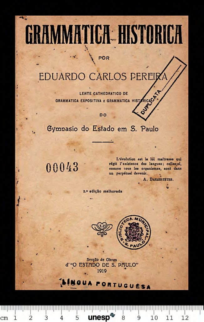 Título completo: Grammatica Historica Local de publicação: São Paulo/Brasil Quantidade de edições: 2? Editora: Secção de Obras d’“O Estado de S. Paulo” Gramática Normativa “[…]grammatica histórica […]. Sobre esta vantagem outras contem o estudo desta matéria, que, nestes últimos tempos, tem tido tão grande incremento nas nações cultas: é elle o laço tradicional que nos […]