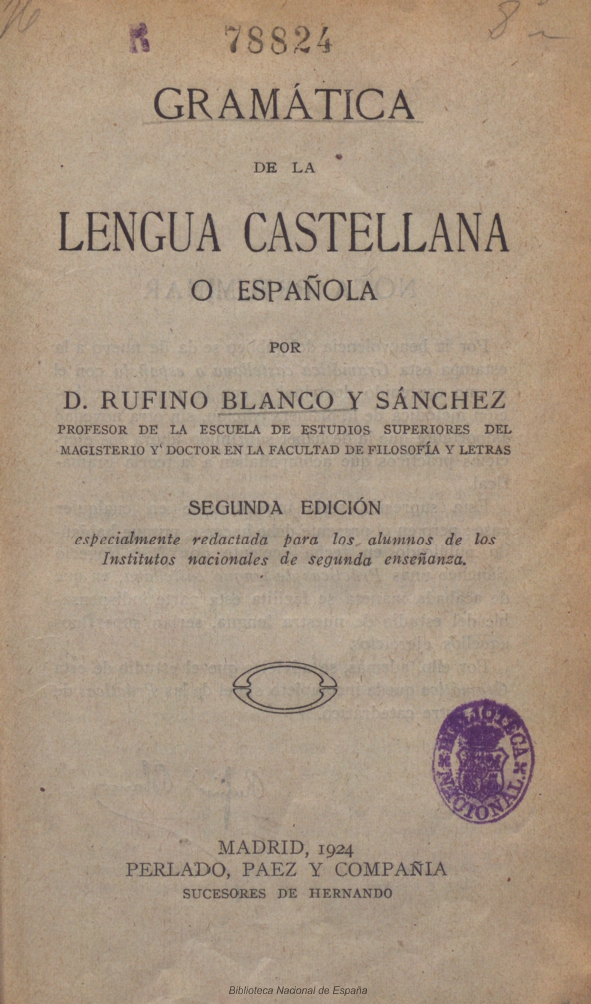Título completo: Gramática de la lengua castellana Local de publicação: Madri/Espanha Quantidade de edições: 2? Editora: Perlado, Paez y Compañía Gramática escolar (LE) “Segunda Edición especialmente redactada para los alumnos de los Institutos nacionales de segunda enseñanza.” (capa). Gramática normativa: “¿QUÉ ES GRAMÁTIVA Y QUÉ GRAMÁTICA CASTELLANA? Gramática, en general, es el arte de […]