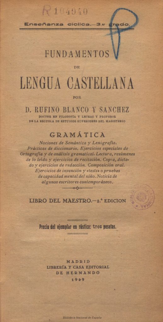 Título completo: Fundamentos de lengua castellana por D. Rufino Blanco y Sánchez Local de publicação: Madri/Espanha Quantidade de edições: 2? Editora: Librería y casa editorial Hernando Gramática escolar (LM) “Los ejercicios de invención incluidos en varias páginas pueden ayudar mucho a tal propósito, siguiendo gloriosos precedentes de la Metodología de la lengua materna en países […]