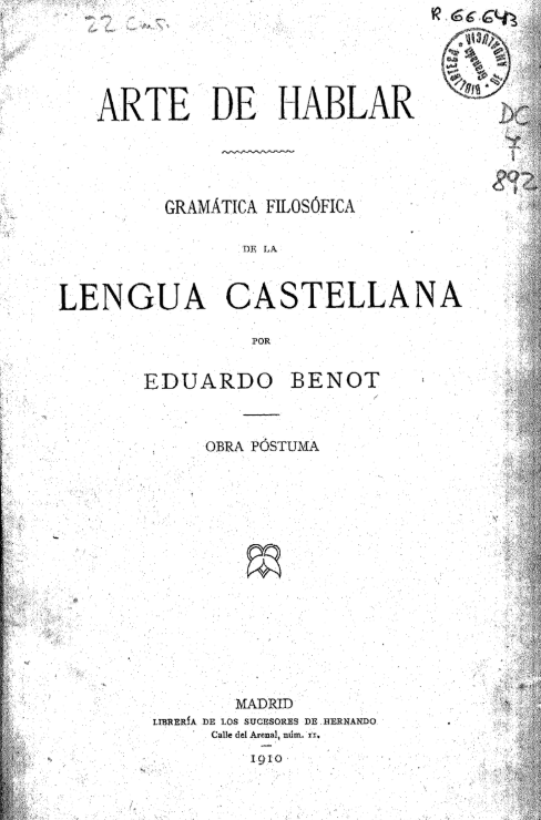 Título completo: Arte de hablar – Gramática filosófica de la Lengua Castellana por Eduardo Benot Local de publicação: Madri/Espanha Quantidade de edições: 2 Editora: Librería de los Sucesores de Hernando Gramática descritiva “Los que adquirieron su saber gramatical exclusivamente por los métodos tradicionales, no podrán menos de experimentar, á veces algo como sensación de extrañeza […]